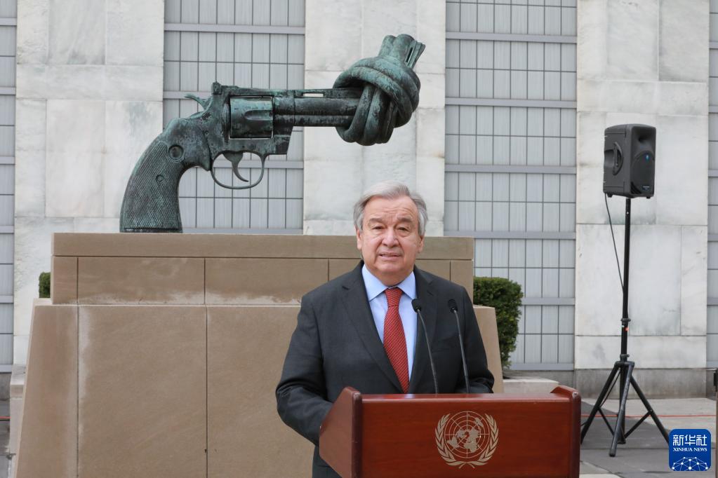 4月19日,联合国秘书长古特雷斯在纽约联合国总部标志性雕塑“打结的手枪”前对记者发表谈话。
