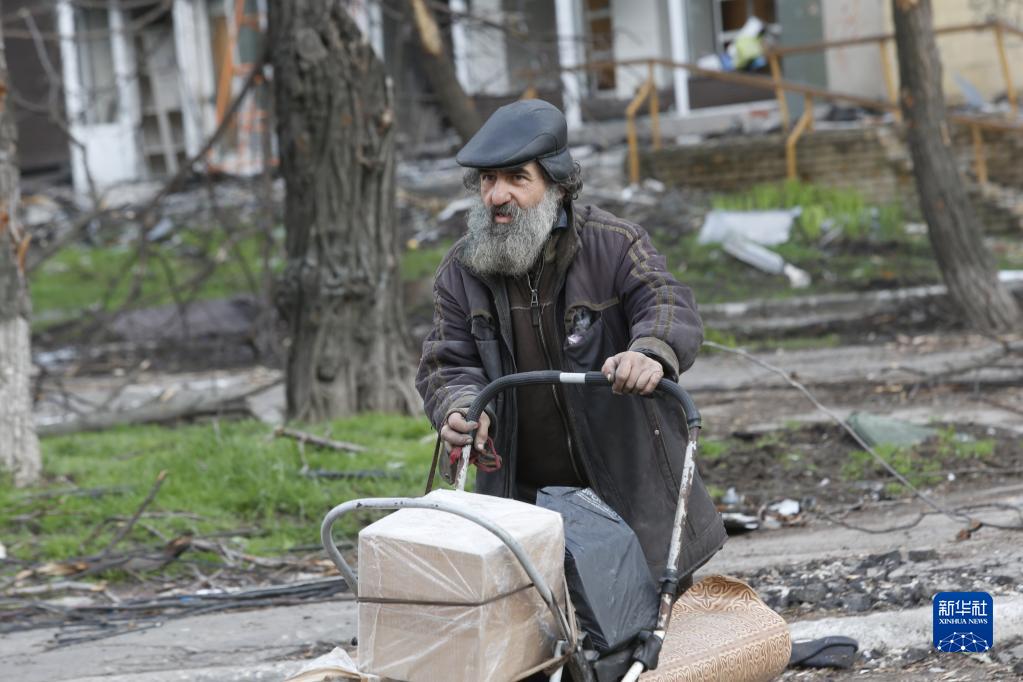 4月22日,在马里乌波尔,当地居民从受损建筑旁经过。