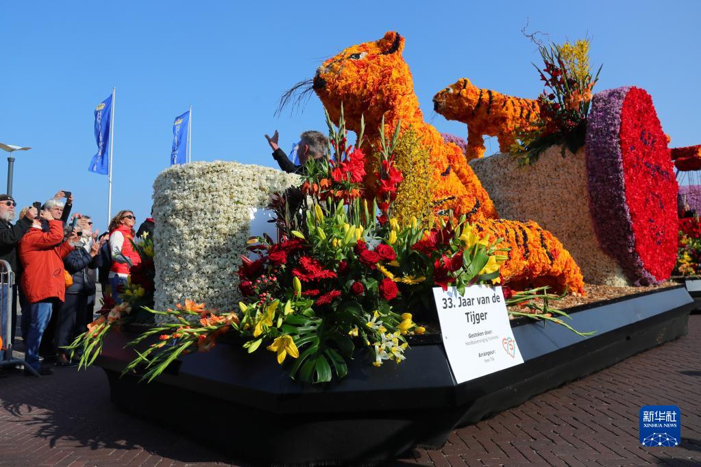 当日,荷兰花车巡游从西部小城诺德韦克市开始,行程约40公里,途经多个城镇。受疫情影响,这项花车巡游活动暂停了两个春季,今年终于重启,主题为“欢庆回忆”。在花车巡游队伍中,海牙中国文化中心用约2万枝鲜花装饰了两组花车造型,庆祝中国和荷兰建交50周年,并向荷兰公众展示中国的虎年生肖文化。