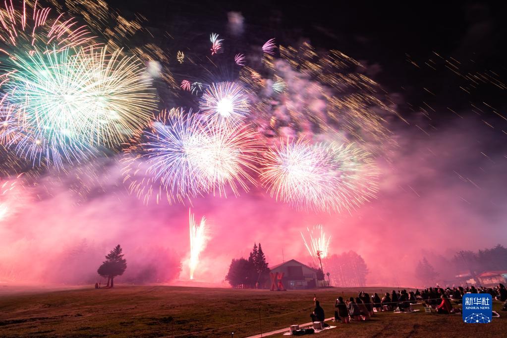 当日,“绝景花火”烟花大会在日本山梨县南都留郡鸣泽村举行。约10000发烟花绽放在富士山脚下,为观众带来绝美体验。