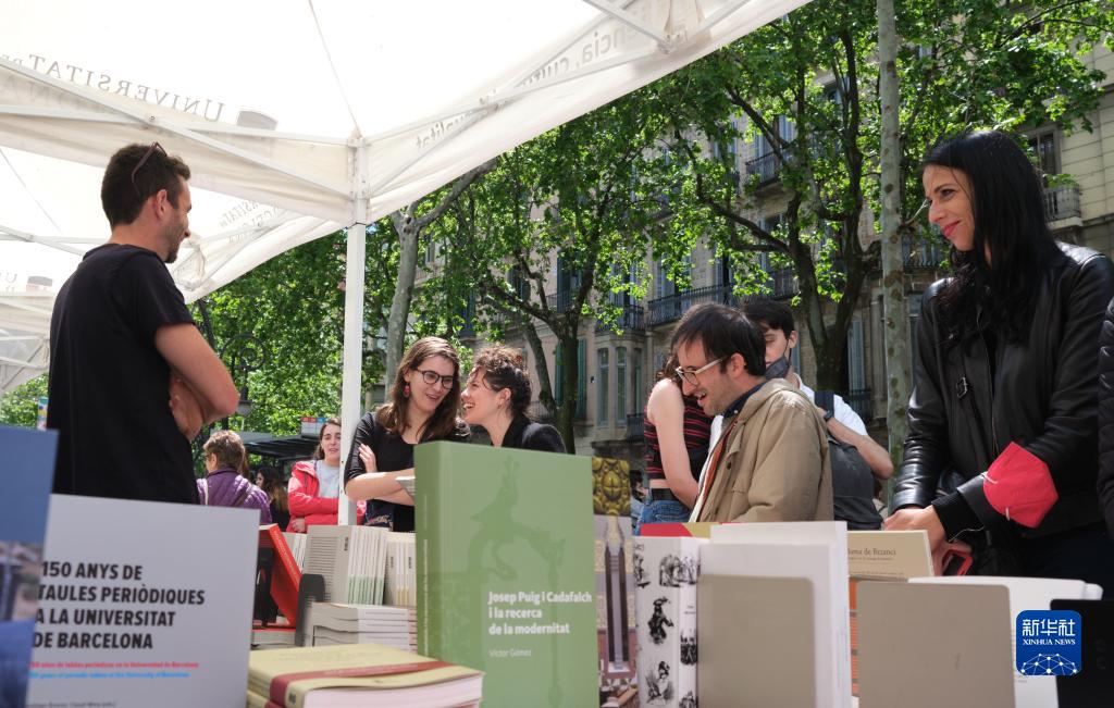 4月23日,人们在西班牙巴塞罗那的一处书摊前驻足。
