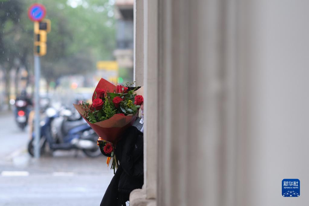 4月23日,一名手持玫瑰花的女子在西班牙巴塞罗那街头避雨。