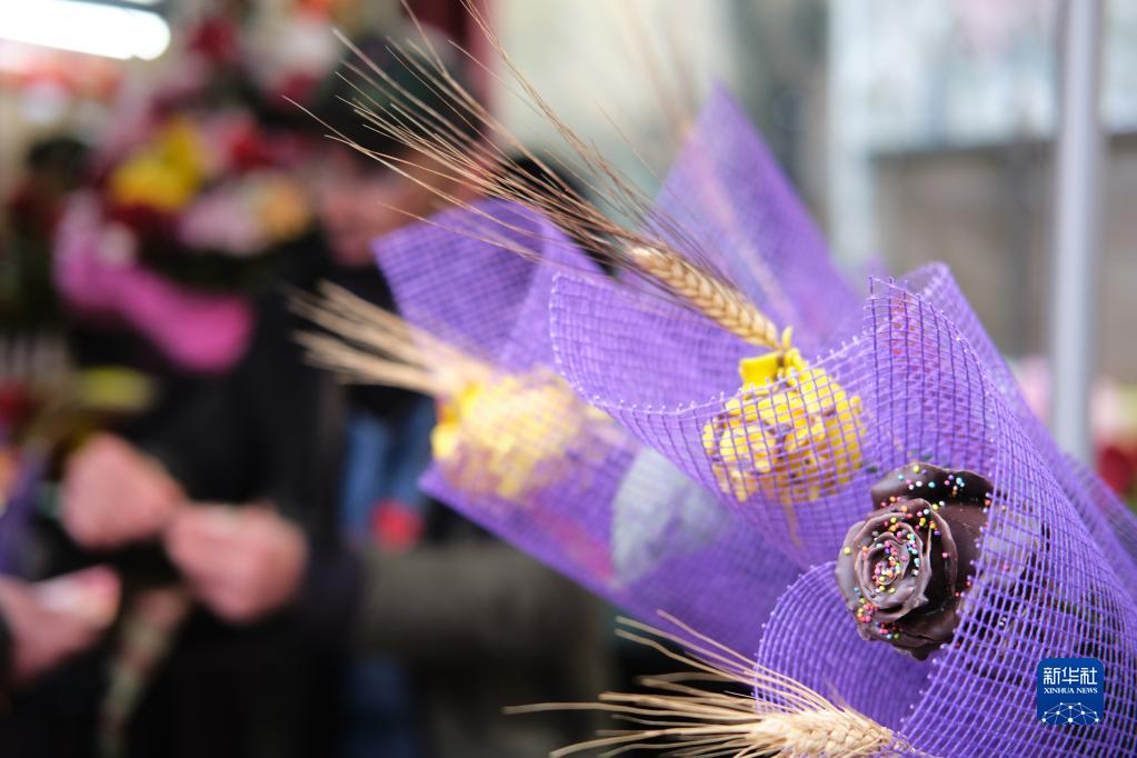 这是4月23日在西班牙巴塞罗那拍摄的用巧克力制作的玫瑰。