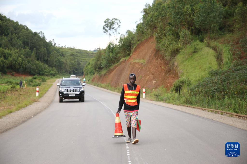 4月21日,一名工人在卢旺达胡耶市通向基贝霍镇的公路上工作。