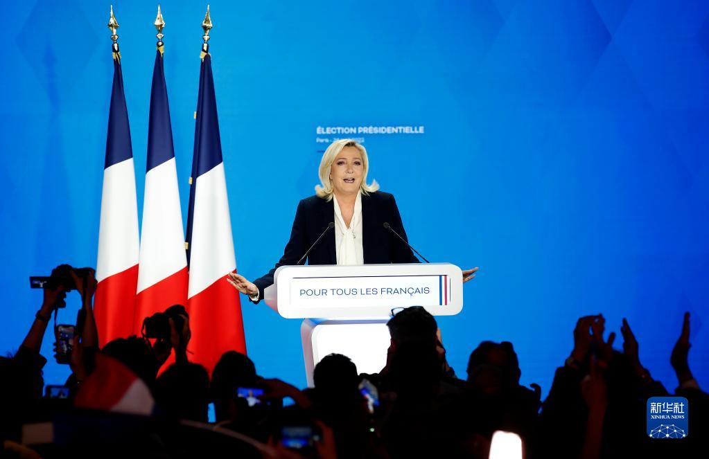 4月24日,法国极右翼政党“国民联盟”候选人玛丽娜·勒庞在巴黎出席选举后的集会。