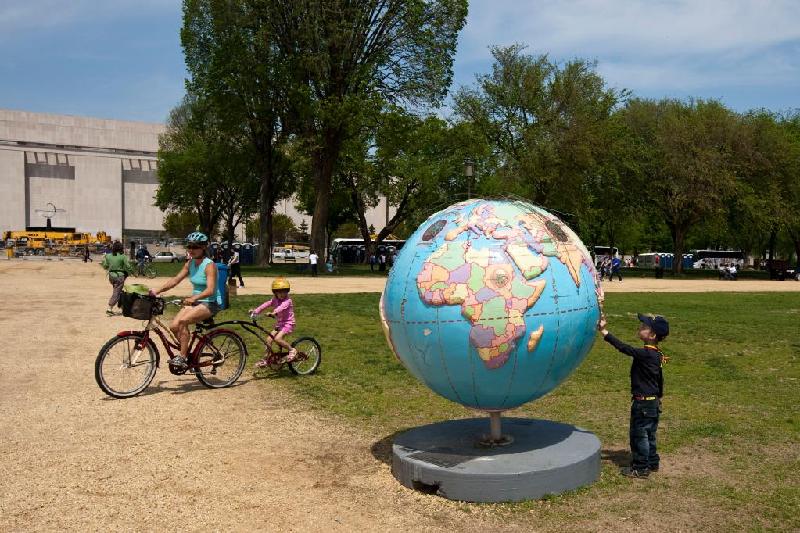 2010年4月22日,在美国首都华盛顿,一名男孩观看一个地球仪。新华社记者朱炜摄