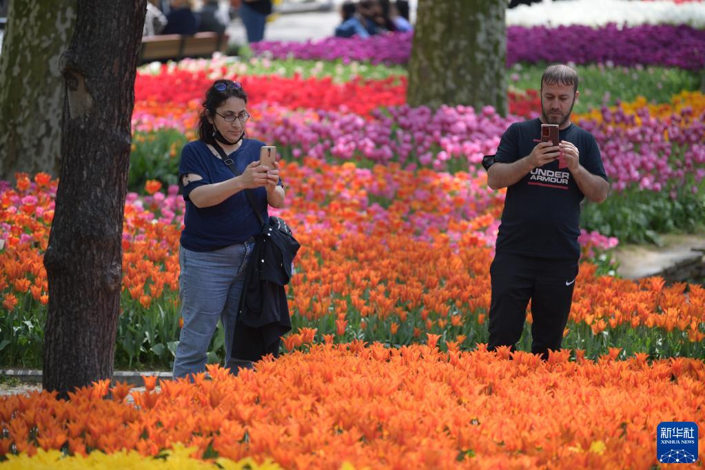 4月25日,游客在土耳其伊斯坦布尔的居尔哈内公园赏花拍照。
