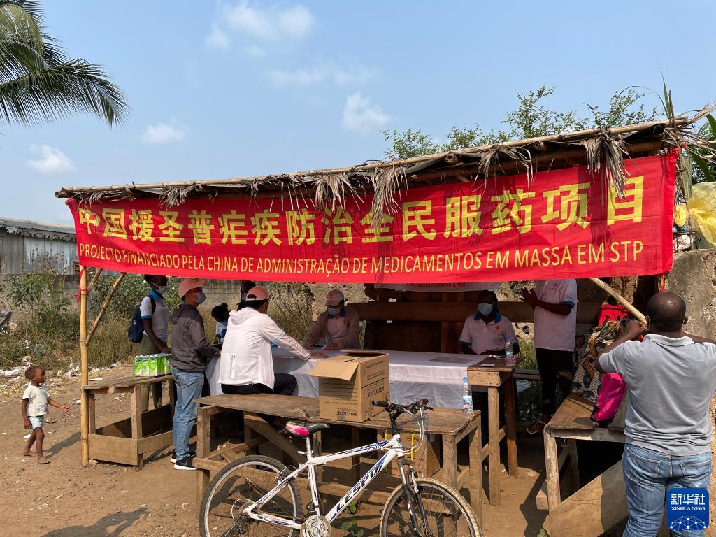 这张2021年7月24日拍摄的资料照片显示,在圣多美和普林西比(简称圣普)首都圣多美郊区,中国援圣普抗疟专家组开展全民服药项目。新华社发(中国援圣普抗疟专家组供图)