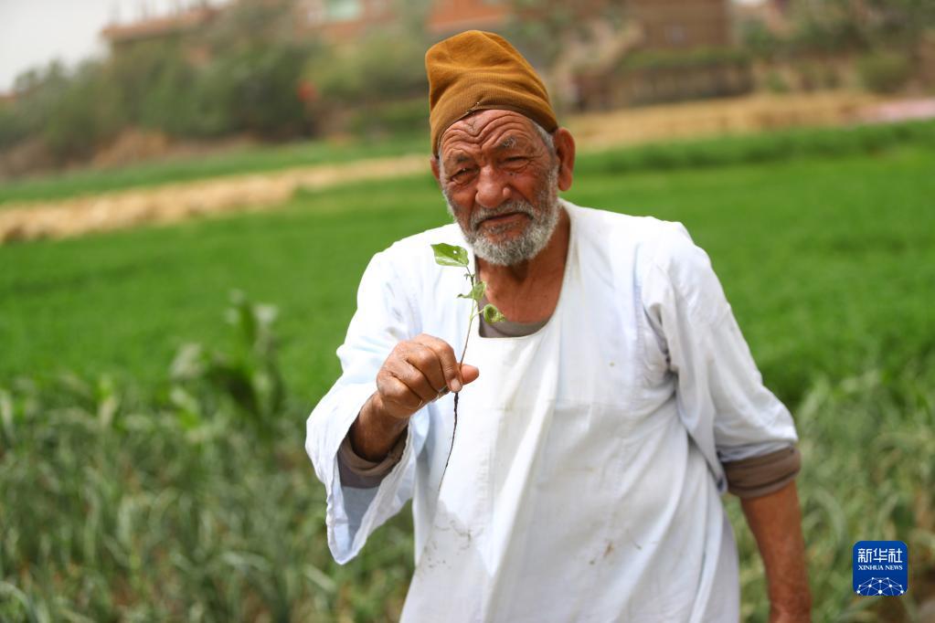 4月25日,在埃及米努夫省,农民艾哈迈德·塔什展示一株棉花幼苗。