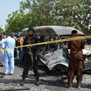 4月26日,安全人员在巴基斯坦卡拉奇查看恐怖袭击现场。新华社发