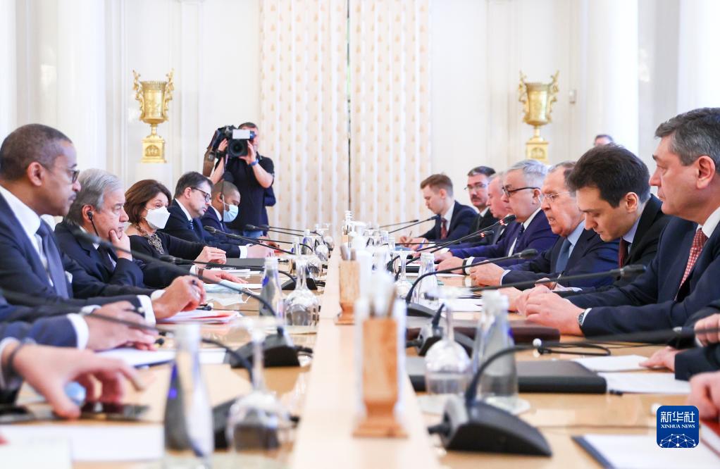4月26日,在俄罗斯首都莫斯科,俄罗斯外交部长拉夫罗夫(右三)会见联合国秘书长古特雷斯(左二)。新华社/塔斯社