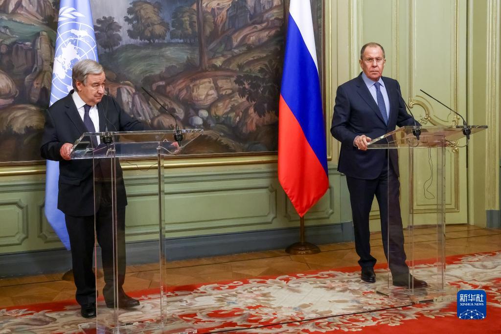4月26日,在俄罗斯首都莫斯科,俄罗斯外交部长拉夫罗夫(右)与联合国秘书长古特雷斯会谈后举行联合记者会。新华社/塔斯社