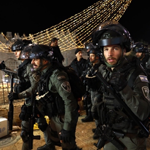 4月20日晚,以色列警察在耶路撒冷老城大马士革门外警戒。新华社发(穆阿马尔·阿瓦德摄)