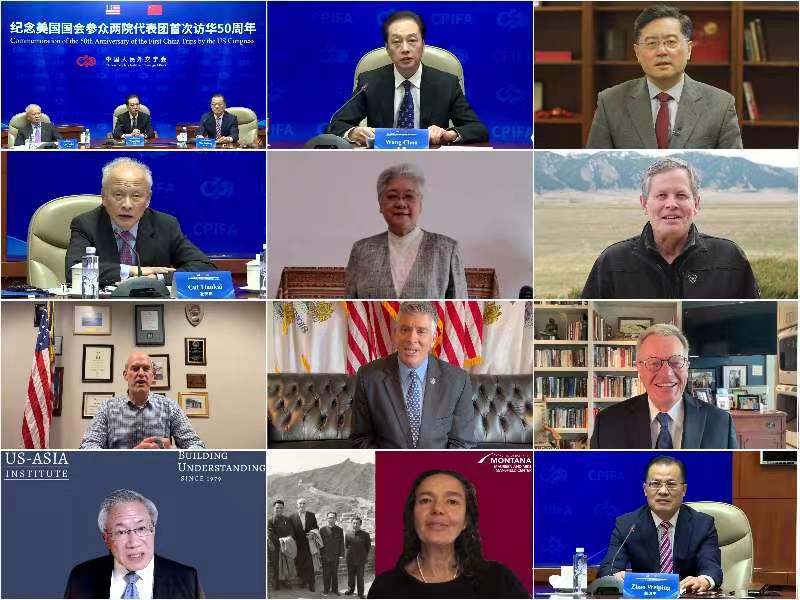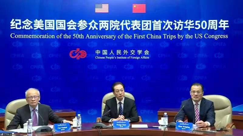 美国会参众两院代表团首次访华50周年纪念活动视频截图。(中国人民外交学会供图)