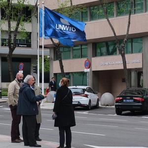 4月27日,人们经过位于西班牙马德里的世界旅游组织总部。