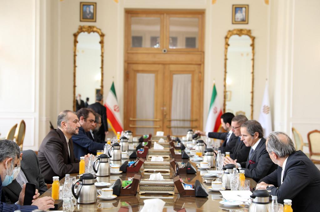 3月5日,伊朗外长阿卜杜拉希扬(左三)在德黑兰会见国际原子能机构总干事格罗西(右二)。新华社发(伊朗外交部供图)
