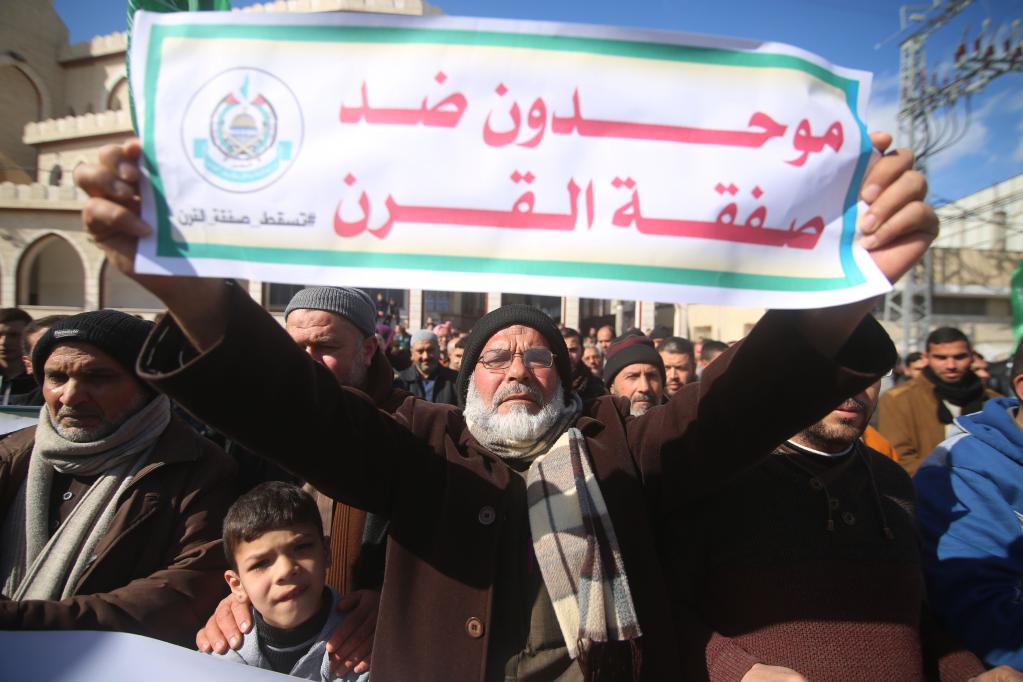 2020年1月31日,在加沙地带城市拉法,一名巴勒斯坦抗议者高举抵制“世纪协议”的标语,抵制备受争议和诟病的美国“中东和平新计划”。新华社发(哈立德·奥马尔摄)