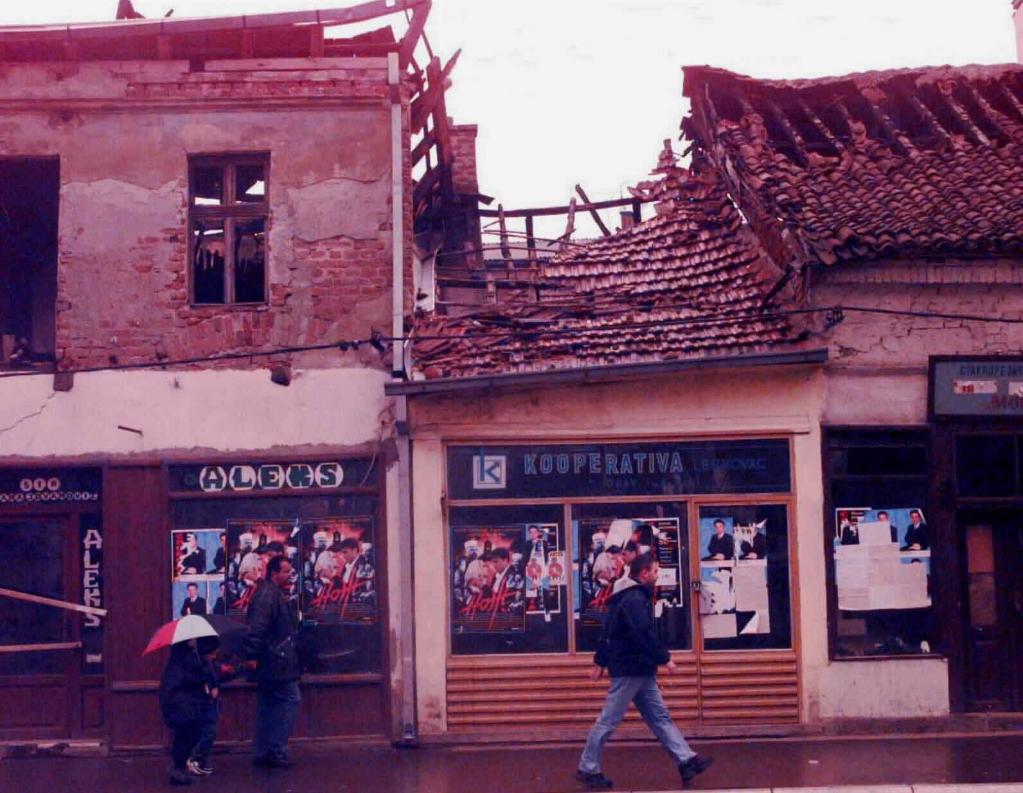 1999年3月28日,南联盟塞尔维亚共和国莱斯科瓦茨市的几位市民从市中心一家被北约炸毁的商店前走过。新华社记者黄文摄