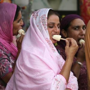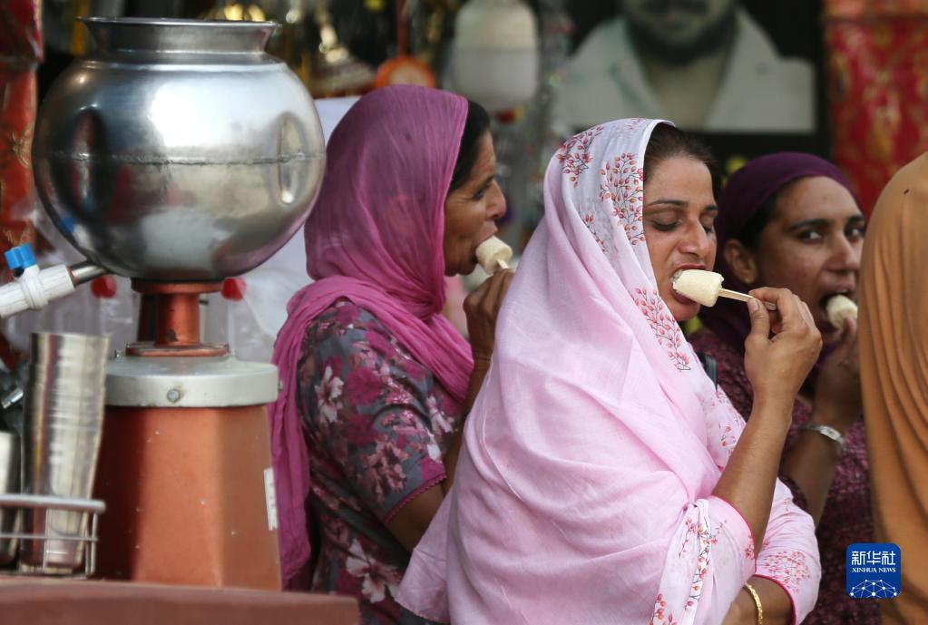 4月29日,在印度阿姆利则,人们吃冰淇淋消暑。