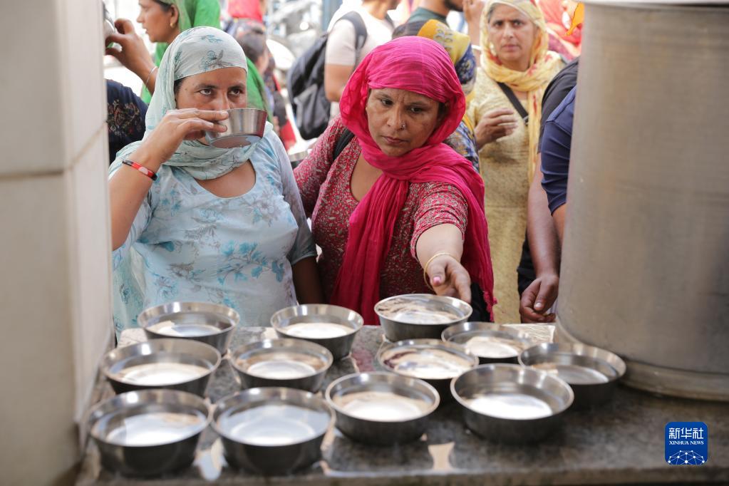 4月29日,在印度阿姆利则,人们喝水消暑。