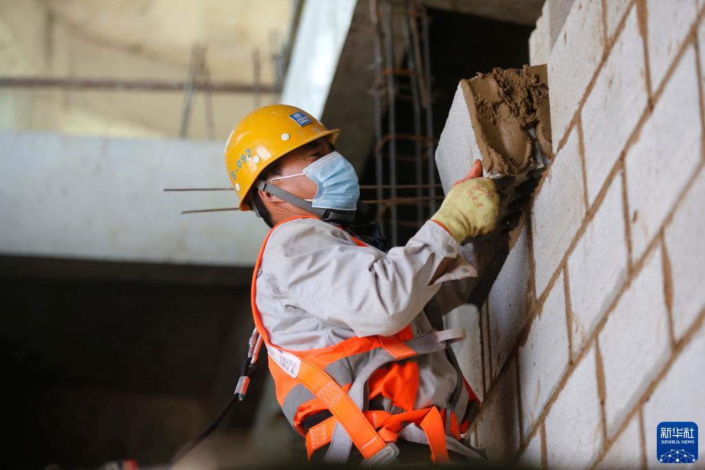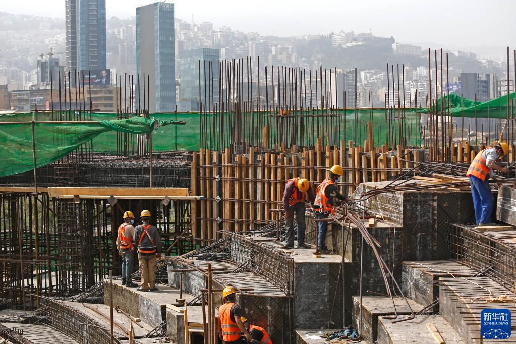 4月27日,在黎巴嫩首都贝鲁特附近的迪巴耶,工人在中国政府援建黎巴嫩国家高等音乐学院项目工地上工作。新华社发(比拉尔·贾维希 摄)
