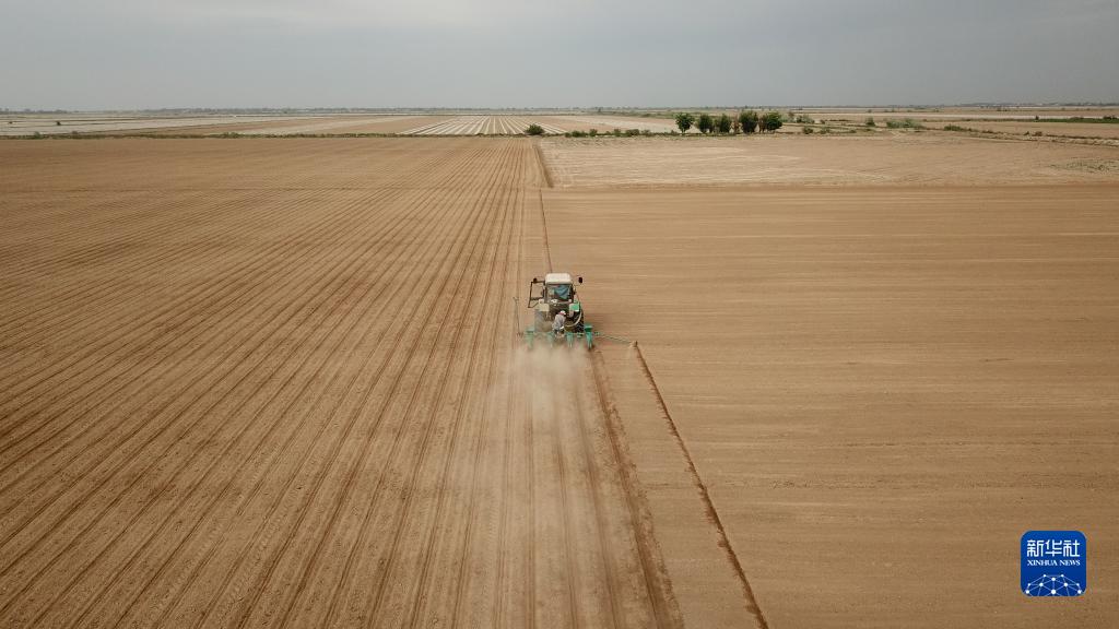 这是4月30日在哈萨克斯坦南部图尔克斯坦州热特赛区“光明之路”农场拍摄的棉花播种场景(无人机照片)。