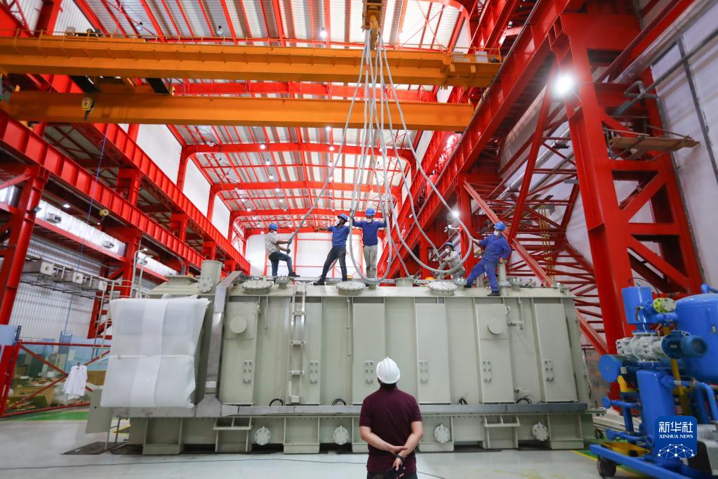 4月21日,在埃及苏伊士省的西电-EGEMAC高压电气有限责任公司设备制造车间,工人对一台变压器成品进行起吊装运。
