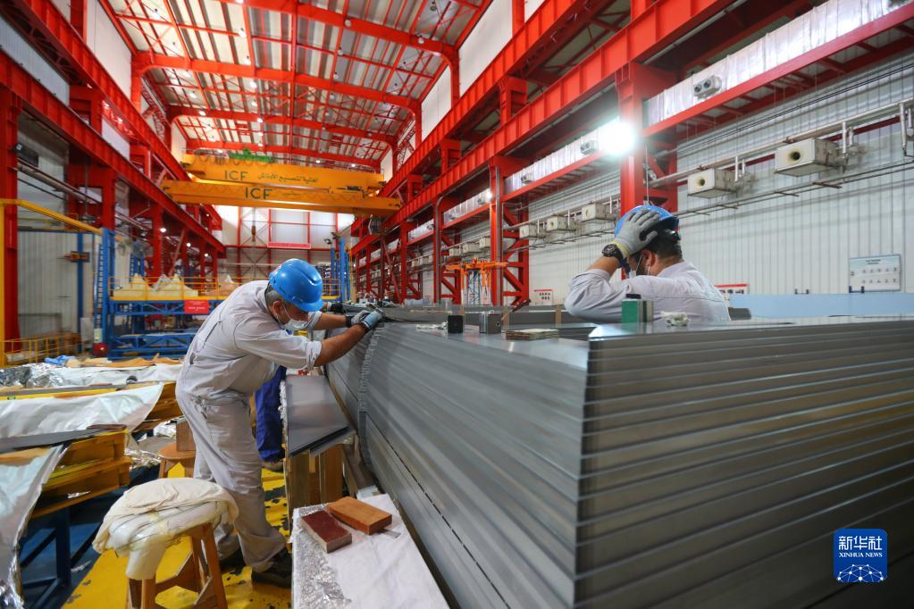 4月21日,工人在埃及苏伊士省的西电-EGEMAC高压电气有限责任公司设备制造车间作业。