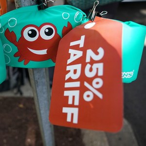 2019年6月17日,在美国华盛顿,一件救生衣上挂着抗议加征关税的标语。(新华社记者刘杰摄)
