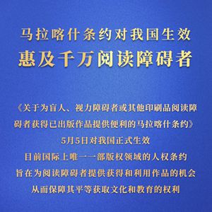 《关于为盲人、视力障碍者或其他印刷品阅读障碍者获得已出版作品提供便利的马拉喀什条约》5月5日对我国生效。作为目前国际上唯一一部版权领域的人权条约,该条约旨在为阅读障碍者提供获得和利用作品的机会,从而保障其平等获取文化和教育的权利。马拉喀什条约对我国生效后,将极大丰富我国阅读障碍者的精神文化生活,提高其受教育程度,推动我国优秀作品海外传播,进一步提升我国在国际版权领域的话语权和影响力。2021年10月23日,十三届全国人大常委会第三十一次会议表决通过了全国人大常委会关于批准该条约的决定。(记者史竞男,海报设计乔昕)