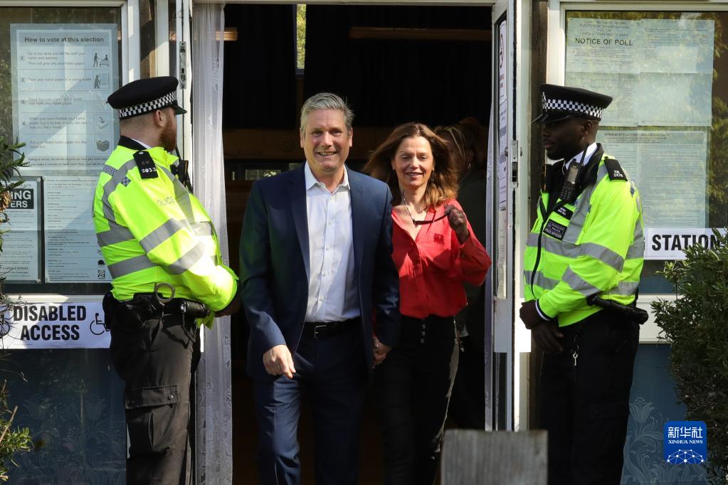 5月5日,英国工党领袖斯塔默(左二)与妻子(右二)在伦敦一家投票站投票后准备离开。