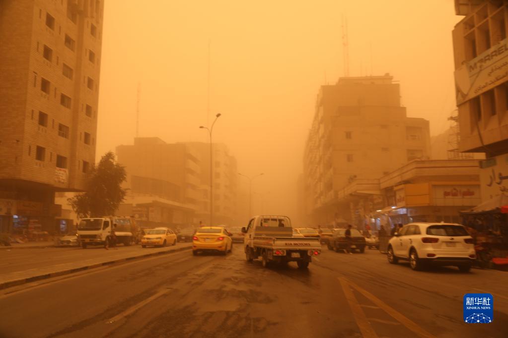 5月1日,在伊拉克巴格达,车辆在沙尘天气中行驶。