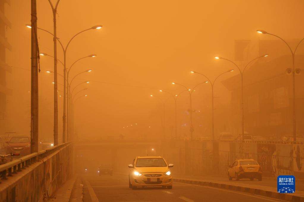 5月1日,在伊拉克巴格达,车辆在沙尘天气中行驶。