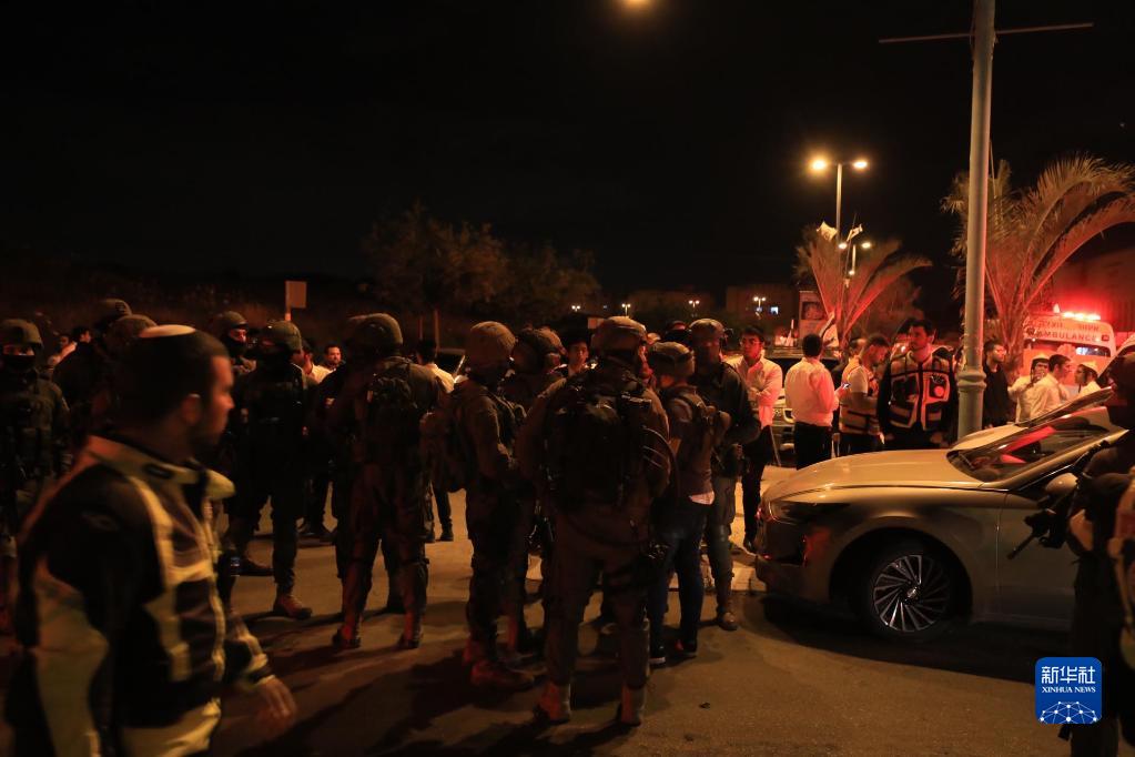 5月5日,以色列安全人员在以中部城市埃拉德袭击现场工作。