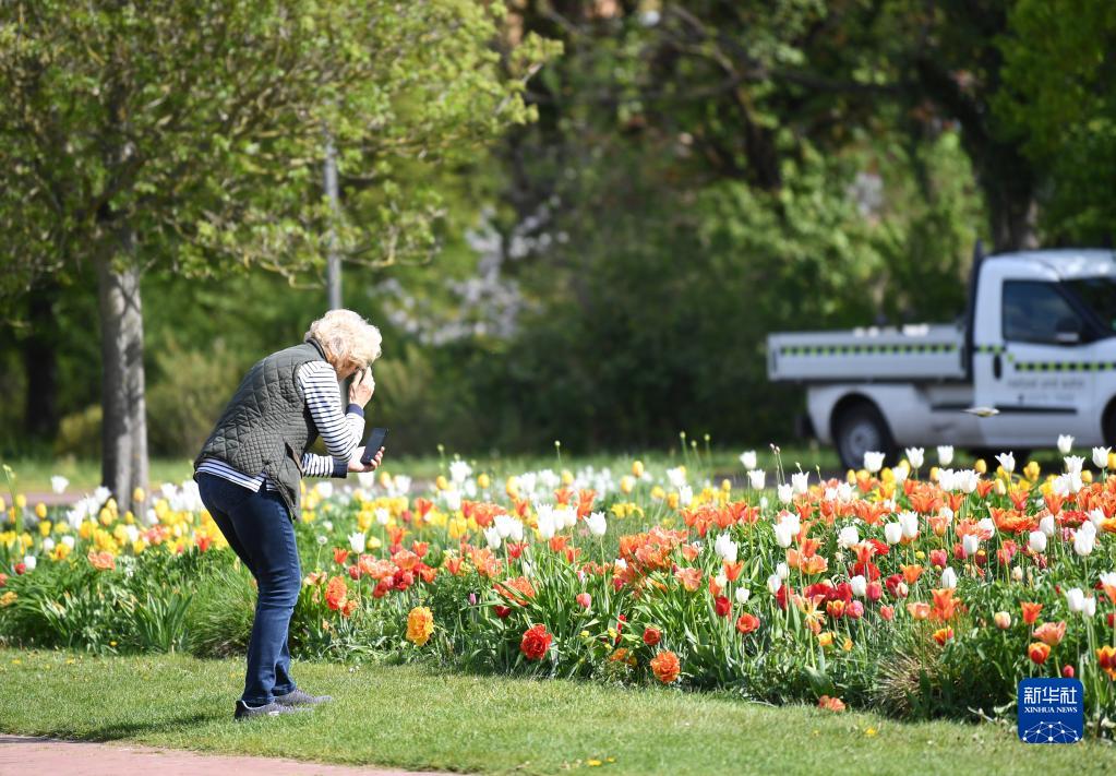 5月6日,一名女子在德国柏林布里茨花园拍摄盛开的鲜花。
