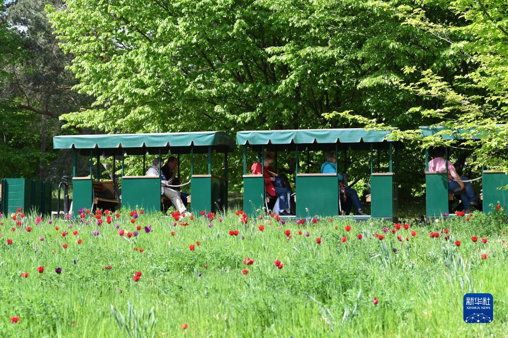 5月6日,人们在德国柏林布里茨花园乘坐小火车观光。