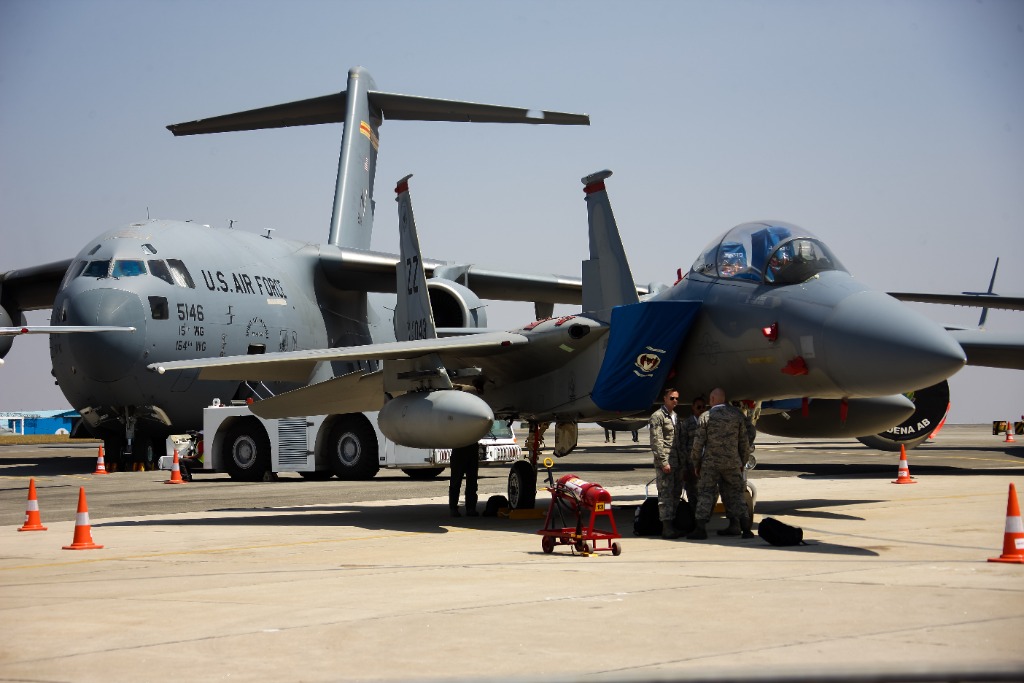 2015年2月18日,美国空军的C-17运输机(左)与F-15战机在印度班加罗尔市的印度航空展上。新华社记者郑焕松摄