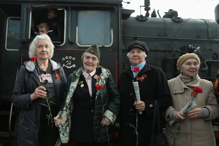 5月6日,人们在俄罗斯圣彼得堡芬兰火车站与蒸汽火车合影。三列蒸汽火车5月6日从拉多加湖方向驶入圣彼得堡的芬兰火车站,重走战争年代为城市运送物资的“生命之路”,纪念卫国战争胜利77周年。新华社发(莫京娜摄)