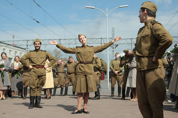 5月6日,参加纪念活动的人员在俄罗斯圣彼得堡芬兰火车站跳舞。新华社发(莫京娜摄)