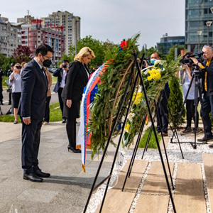 塞尔维亚内务部长武林,劳动、就业、退伍军人与社会事务部长泰帕夫切维奇以及中国驻塞尔维亚大使馆临时代办田一澍,一同向使馆旧址前的纪念碑敬献花圈并默哀。