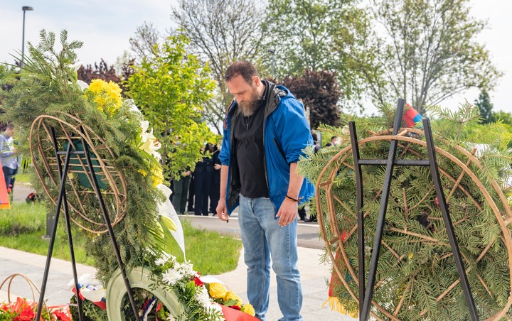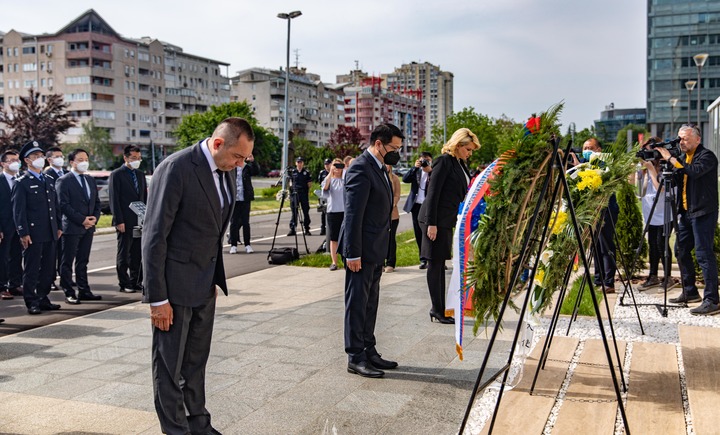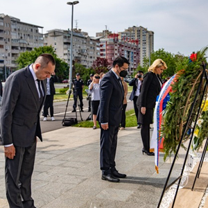 塞尔维亚内务部长武林,劳动、就业、退伍军人与社会事务部长泰帕夫切维奇和中国驻塞尔维亚大使馆临时代办田一澍,一同向纪念碑敬献花圈并默哀。