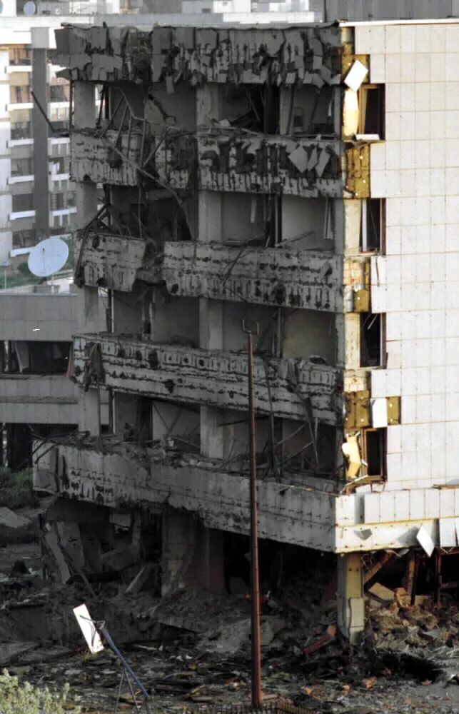 图为大使馆在爆炸中严重被毁的一侧建筑。新华社记者黄文摄