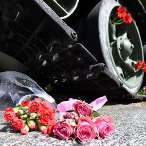 5月8日,在德国首都柏林的德俄博物馆,人们在一辆用于展览的坦克旁献花。新华社记者 任鹏飞 摄