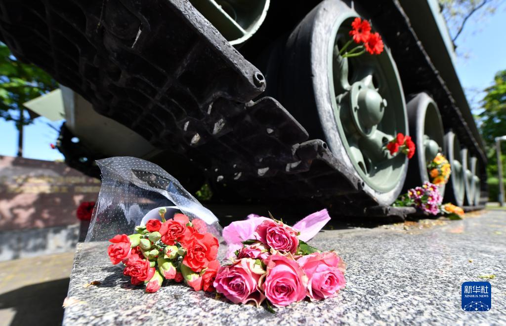 5月8日,在德国首都柏林的德俄博物馆,一辆用于展览的坦克旁摆放着鲜花。新华社记者 任鹏飞 摄