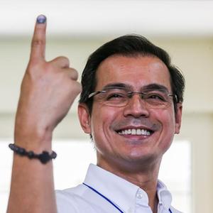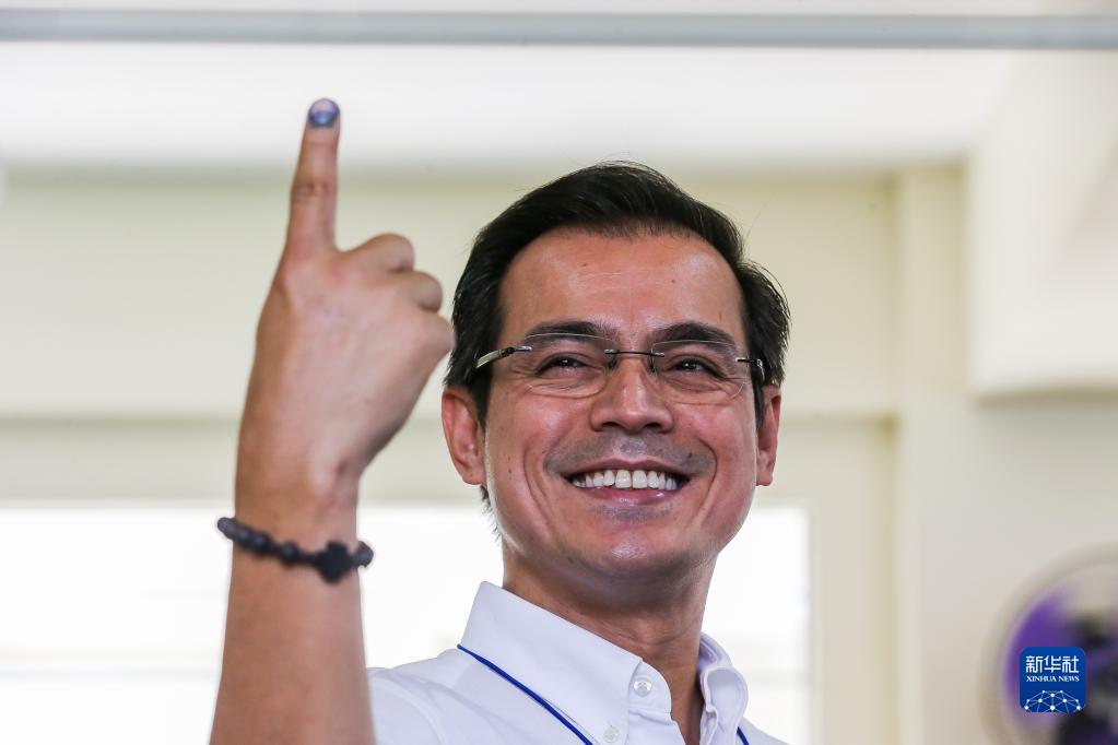5月9日,在菲律宾马尼拉,菲律宾总统候选人弗朗西斯科·莫雷诺·多马戈索在投票后展示手指上的墨水。