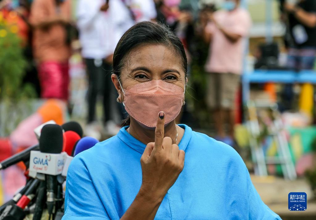 5月9日,在菲律宾南甘马省,菲律宾总统候选人莱妮·罗布雷多在投票后展示手指上的墨水。