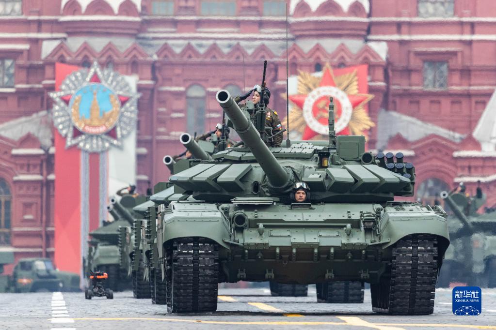 5月9日,在俄罗斯首都莫斯科,T-72B3M坦克编队驶过红场。