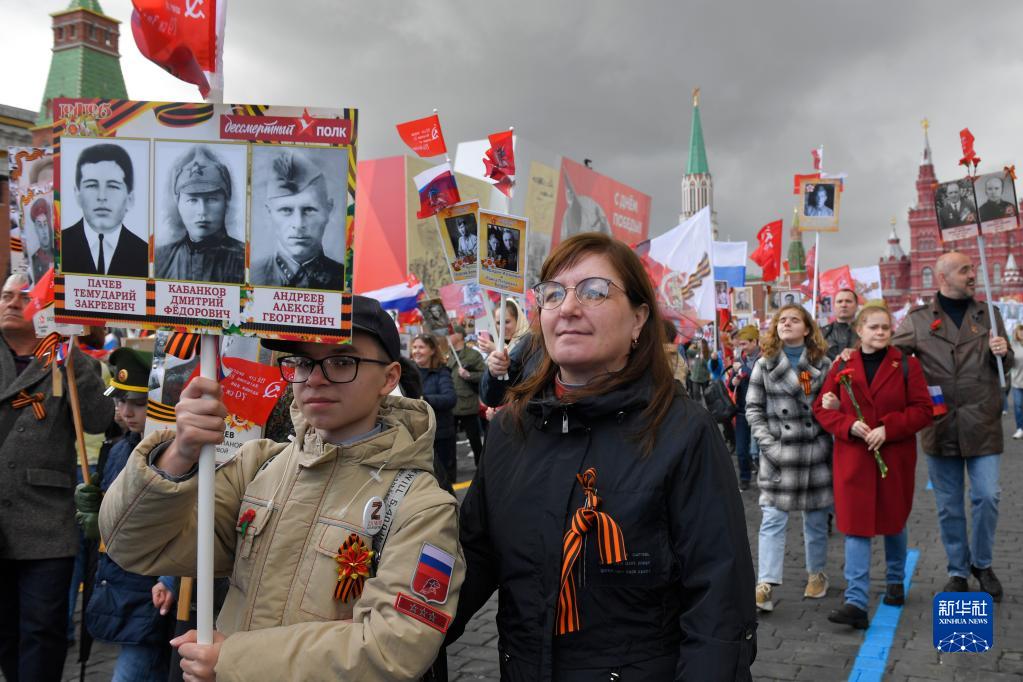 5月9日,在俄罗斯首都莫斯科,人们手持老战士照片参加“不朽军团”游行。