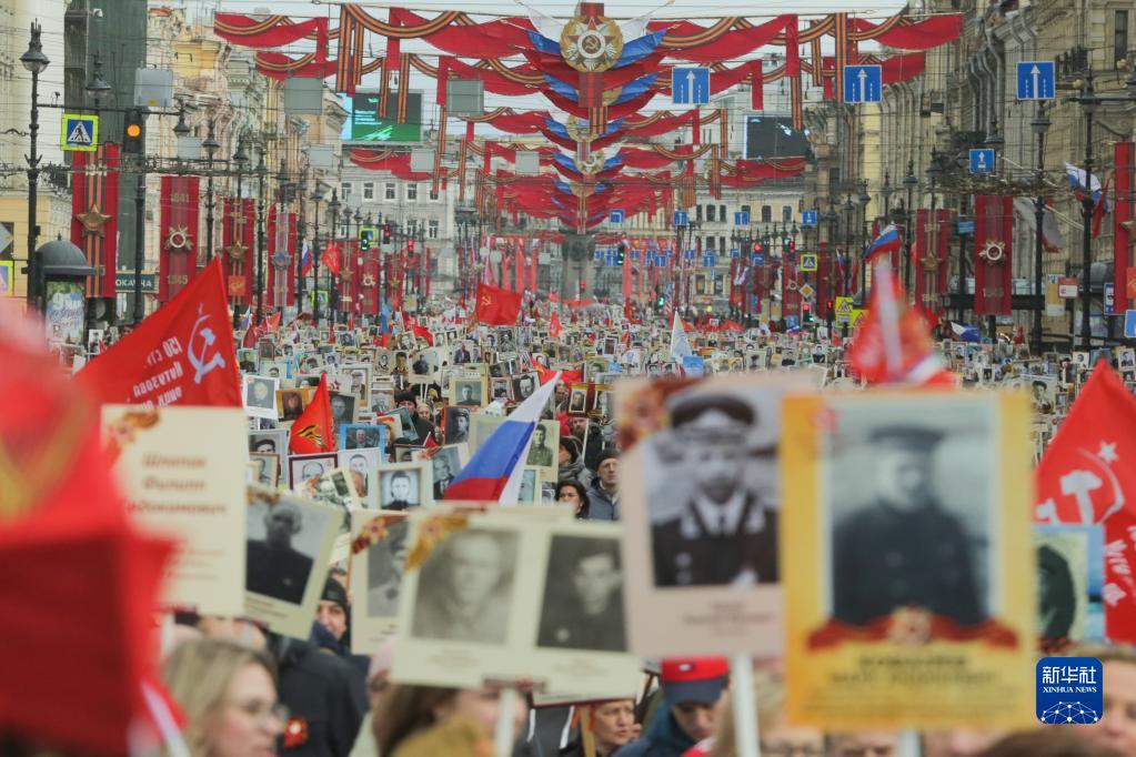 5月9日,俄罗斯圣彼得堡民众手持老战士的照片或画像参加“不朽军团”游行。