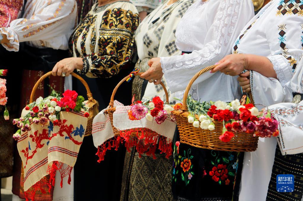 5月8日,在罗马尼亚首都布加勒斯特,身穿传统服装的女士们参加民族服装日活动。